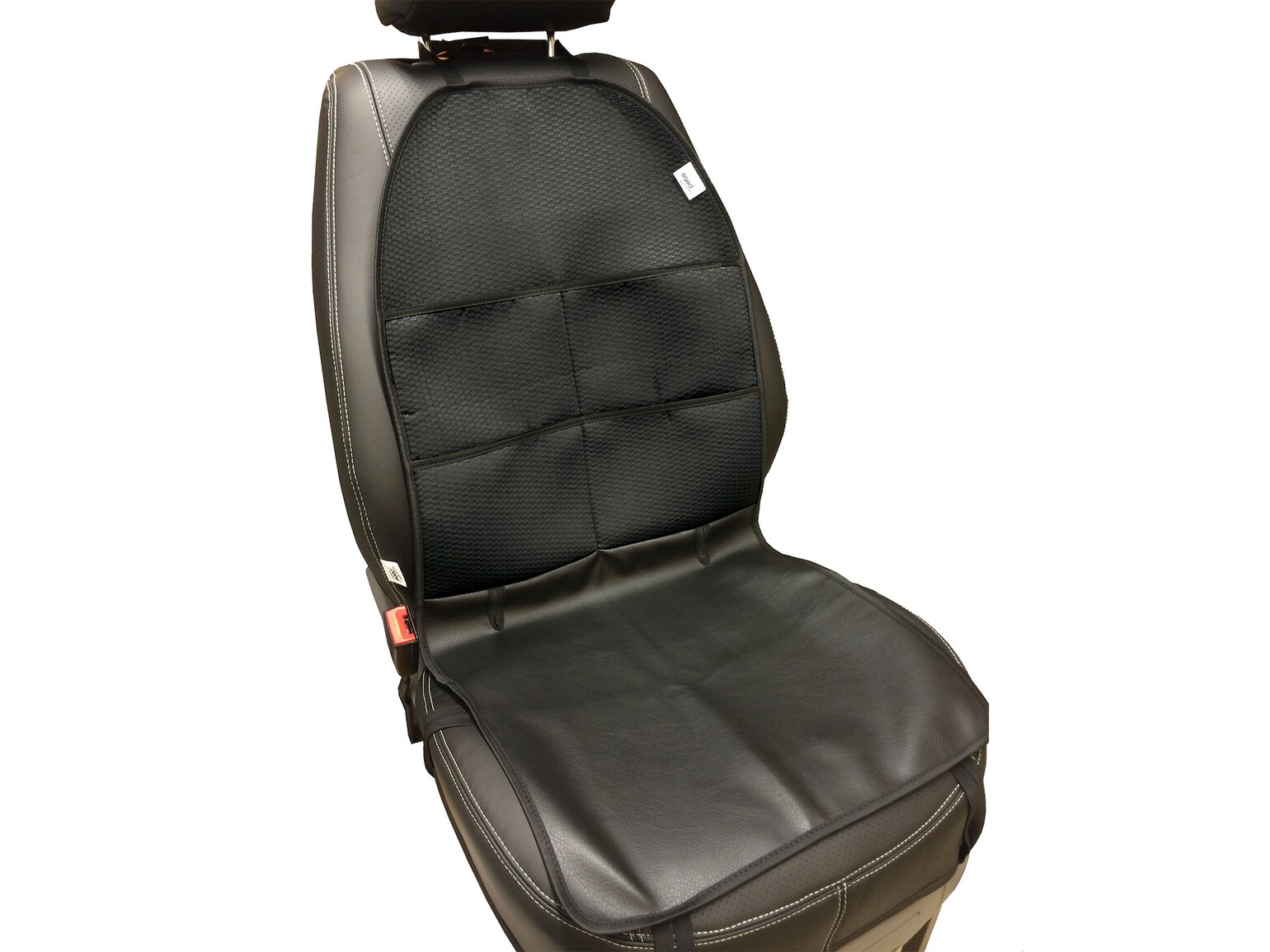 Praktiskt sparkskydd med förvaringsfickor i svart tyg och konstläder för extra slitstyrka. Skyddet kan monteras i fram- eller baksäte för framåt- eller bakåtvända bilstolar.