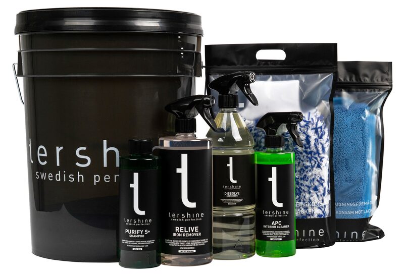 Tershines stora bilvårdshink med allt du behöver för att hålla bilen ren och fin. Innehåller hink 20 l, stor torkduk, svamp, Purify S+ schampo, APC interiörrengöring Grönt Äpple, Dissolve avfettning 1 l samt Relieve fälgrengöring 1 l.