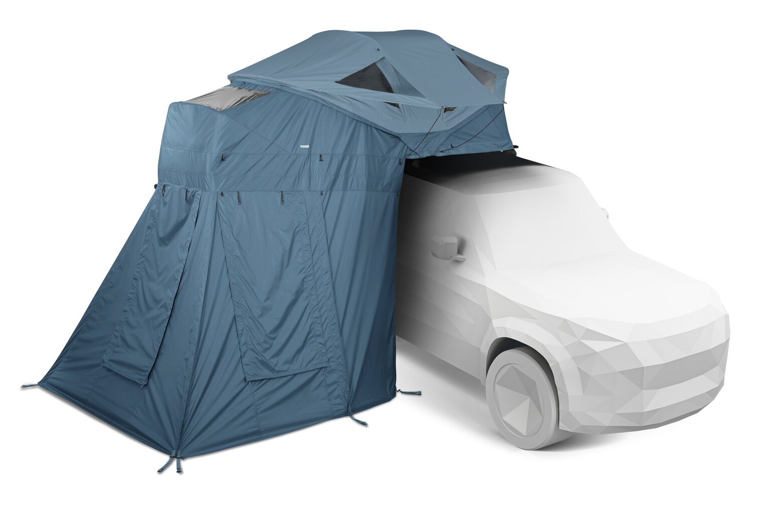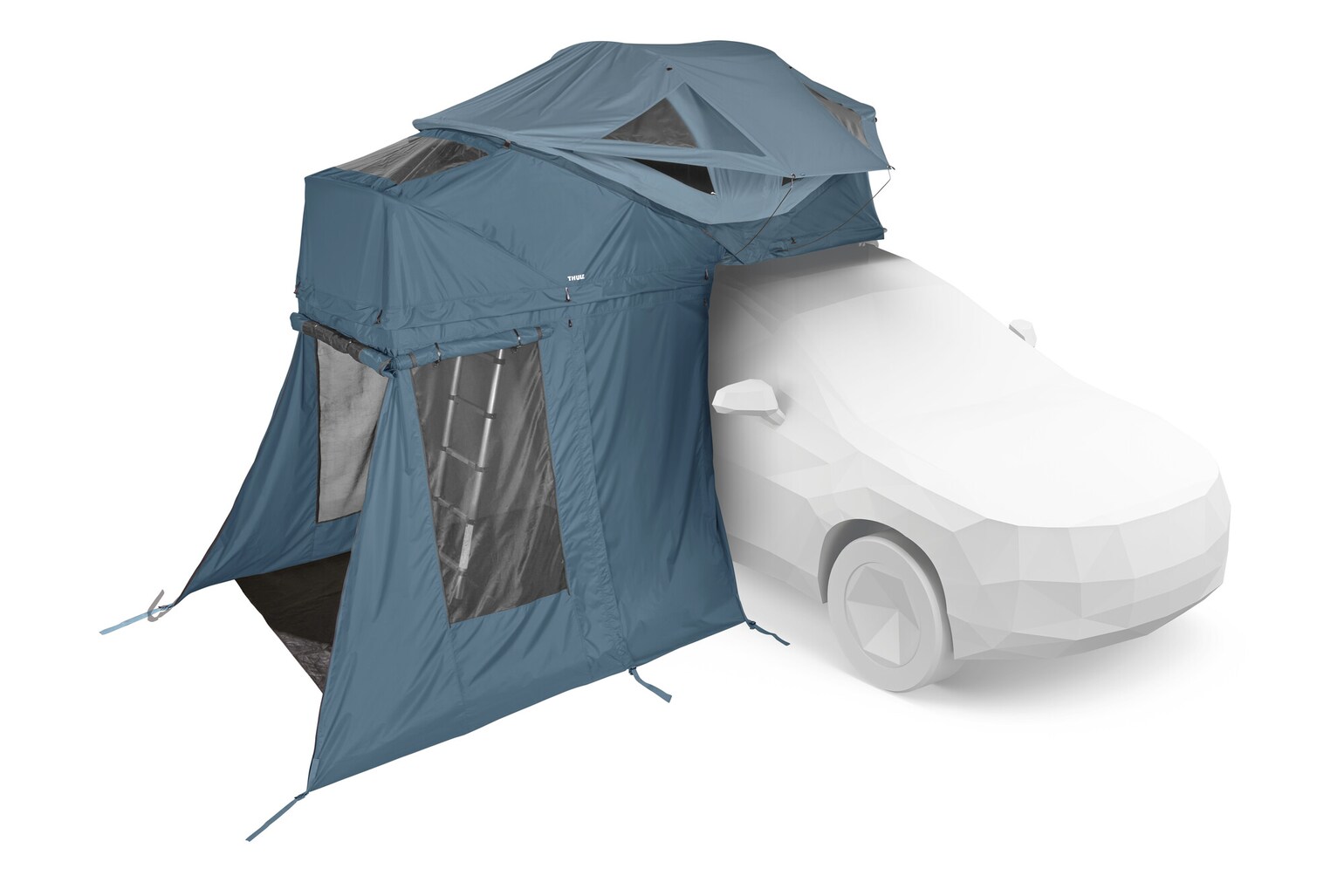 Förtält som passar till taktältet Thule Approach. Fördubblar taktältets yta. Levereras med separat golvpresenning. Passar bilar där taktältets golv är 160-215 cm över marken. Väggarna kan rullas upp helt eller rulla upp ventilationsluckor med myggnät.