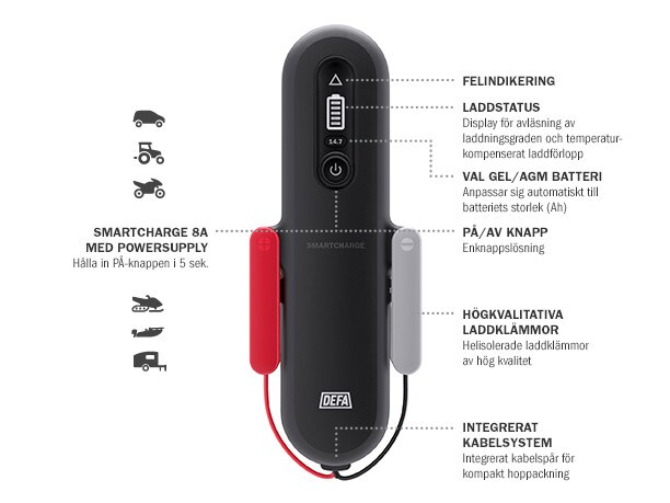 Den smarta laddaren från DEFA läser automatiskt av batteriet du kopplar den till och anpassar laddningen efter batteriets laddningsnivå, storlek och omgivningens temperatur för att inte riskera överladdning.