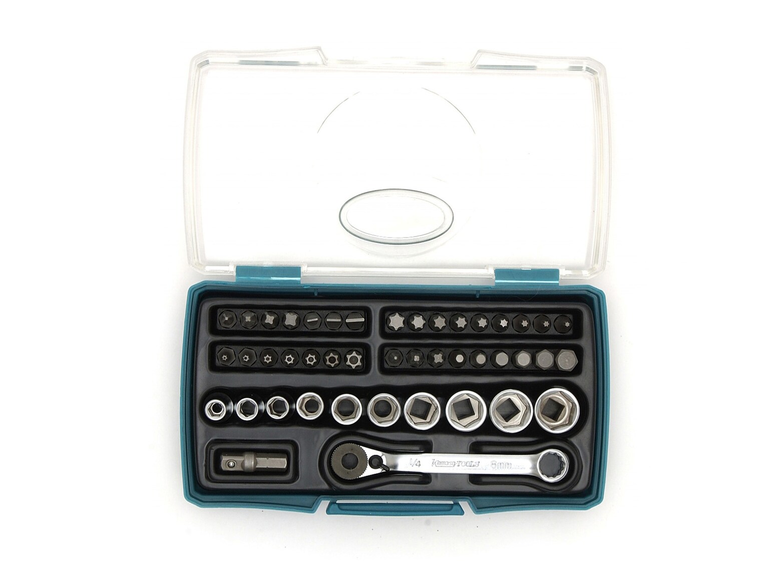 Kamasa Tools hylsnyckelsats innehåller alla nödvändiga verktyg. Den smidiga lådan kommer med ett komplett sortiment av 1/4 hylsor och bits samt 60 tänders minispärrnyckel. Med minispärrsnyckel kommer du lättare åt alla olika skruvar och bultar.