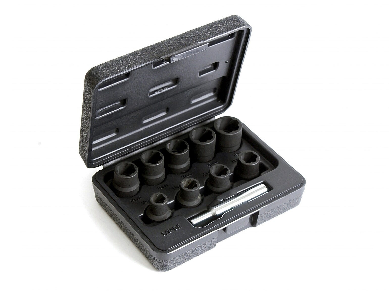 Perfekt sats med nio skärande hylsor för att demontera skadade bultskallar och oljepluggar.